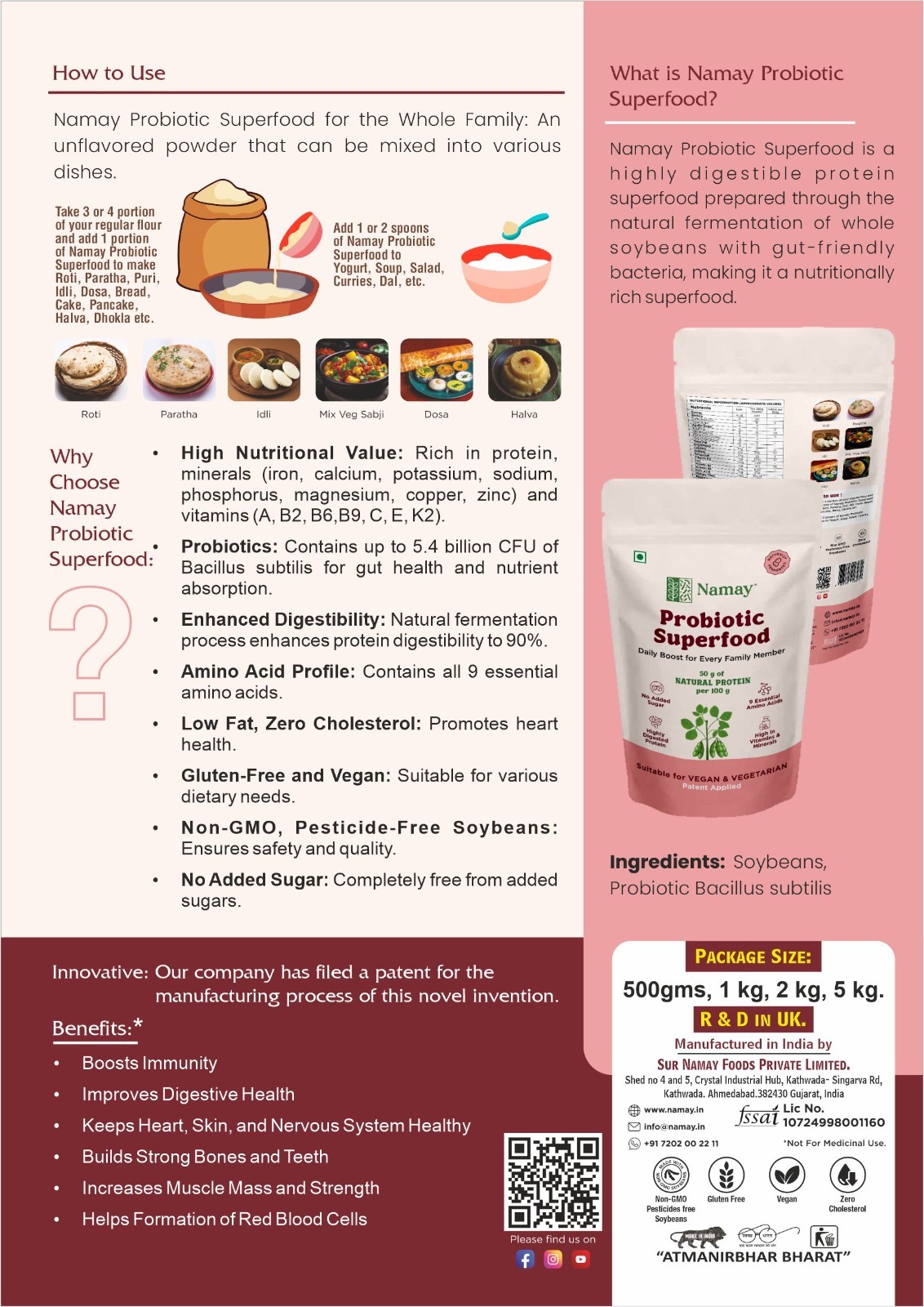 • Mix 1 cup of Namay Probiotic Superfood with 3 to 4 cups of your regular atta to make roti, paratha, puri, dosa, idli, dhokla, halwa, etc.